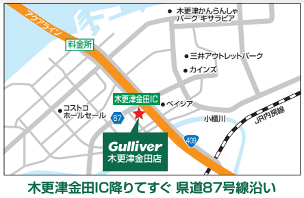 木更津金田IC降りてすぐ、県道87号線沿い ※下記アクセスマップ参照。 |