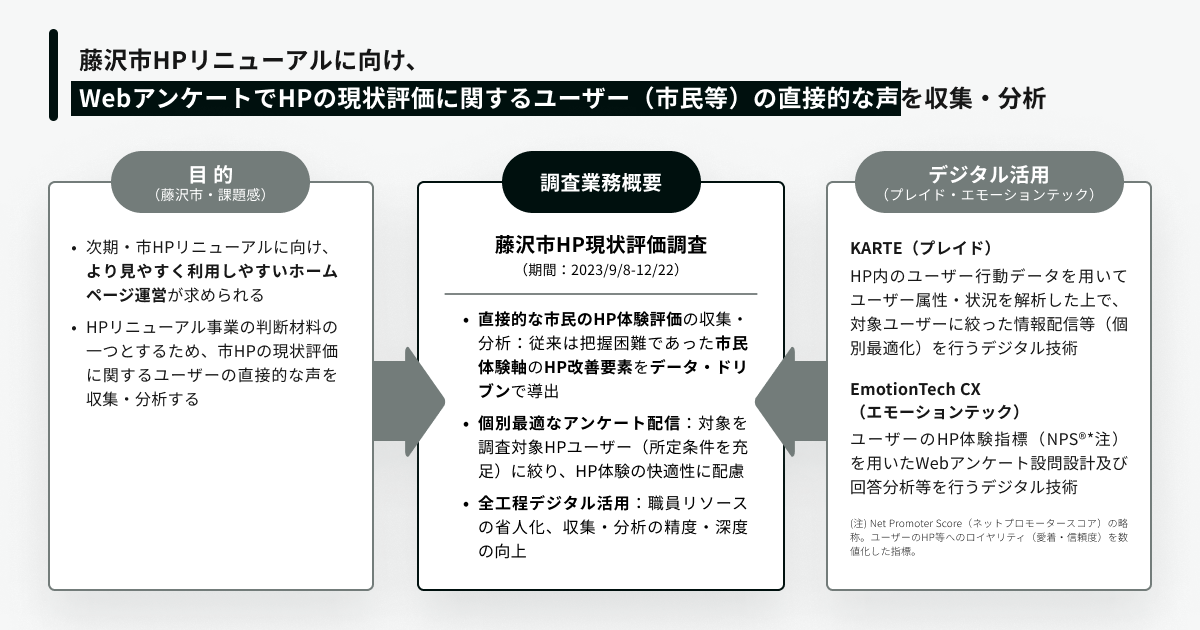 プレイドが提供するCXプラットフォームKARTEにより藤沢市公式HP上で調査対象ユーザー(HP内3回遷移などの条件を充したユーザー)に限定したWebアンケート案内を掲出し、対象ユーザーにはエモーションテックが独自に用意した専用ページでアンケート回答を促します。回答結果はエモーションテックのNPS調査運用プラットフォーム「EmotionTech CX」で解析し、HPへの愛着度や信頼度といったロイヤルティ要因の可視化と改善要素の導出をNPS値化などの形で行います。