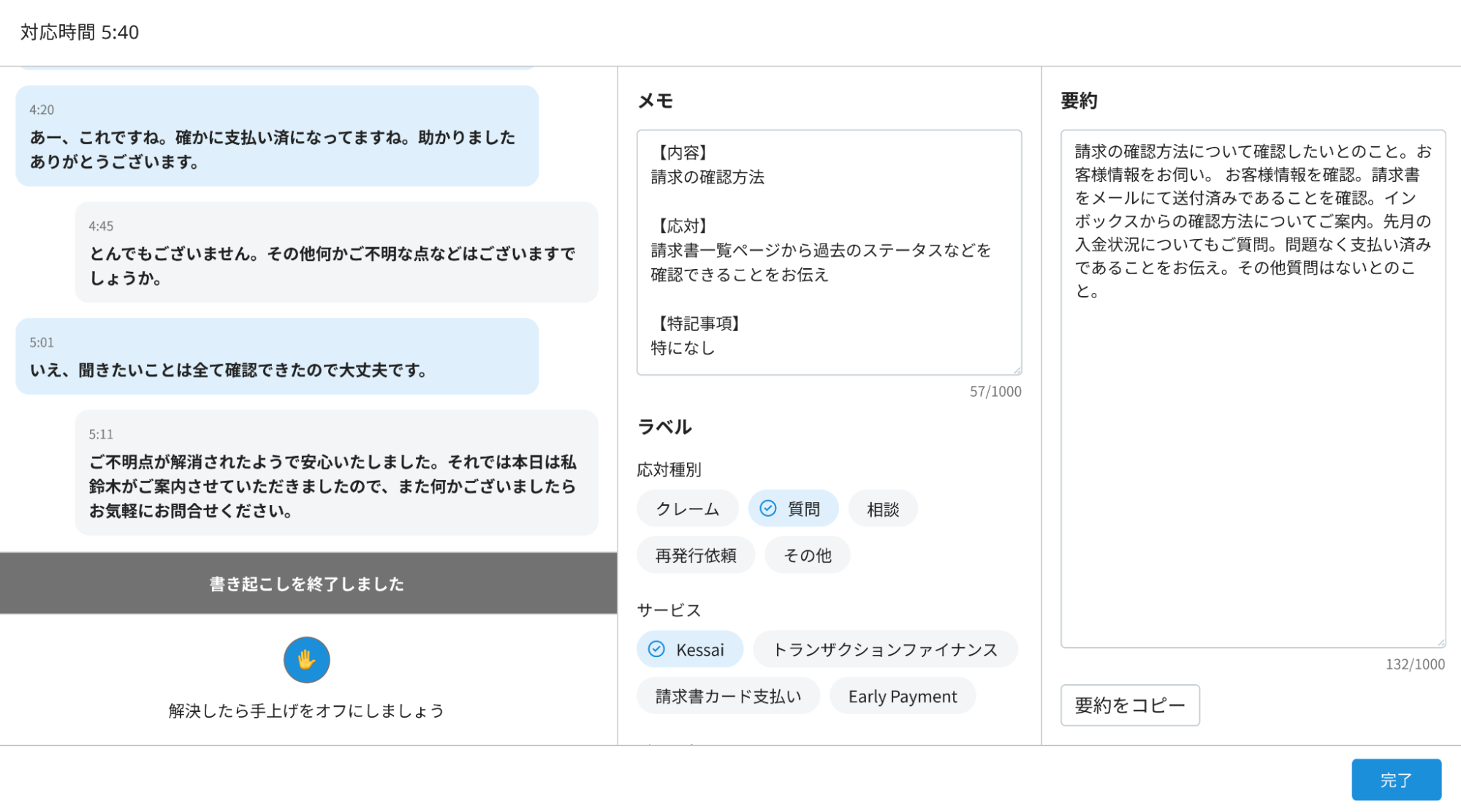請求業務代行という事業の特性上、お支払いやご請求にかかわるサポートも多く、お客さまにより安心してご利用いただくためには、オペレーターによる電話応対というチャネルは欠かせないものだと考えています。その一方、事業拡大に伴い業務負荷の軽減は急務でした。そこで、ACWに着目して内製も含めた改善策を検討していました。