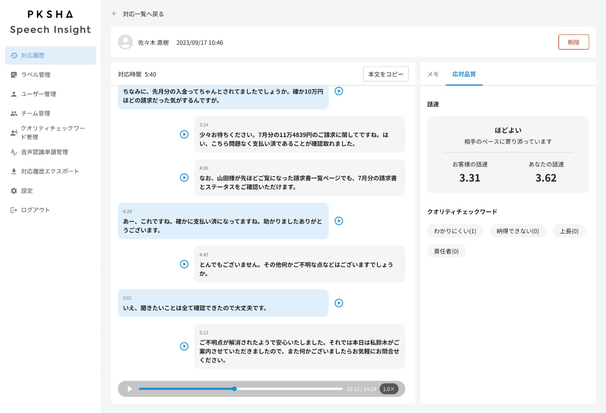 「PKSHA Speech Insight」は、単なる高精度な文字起こしに留まらず、カスタマーサポート業務に特化した機能設計がされており、特にデモで拝見したAI要約機能のビションが現場が求める内容に合致していました。
