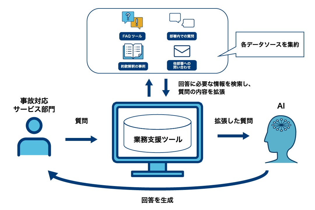 この度、イーデザイン損保では、DXの一環として、RAG(※1)という生成AI技術を活用し、事故対応サービスに特化した業務支援ツールを自社開発しました。社員が同ツールに質問を入力すると、AIが社内で保有する様々なマニュアルや保険約款解釈の事例、社内FAQ等を参照し、迅速に回答します。
