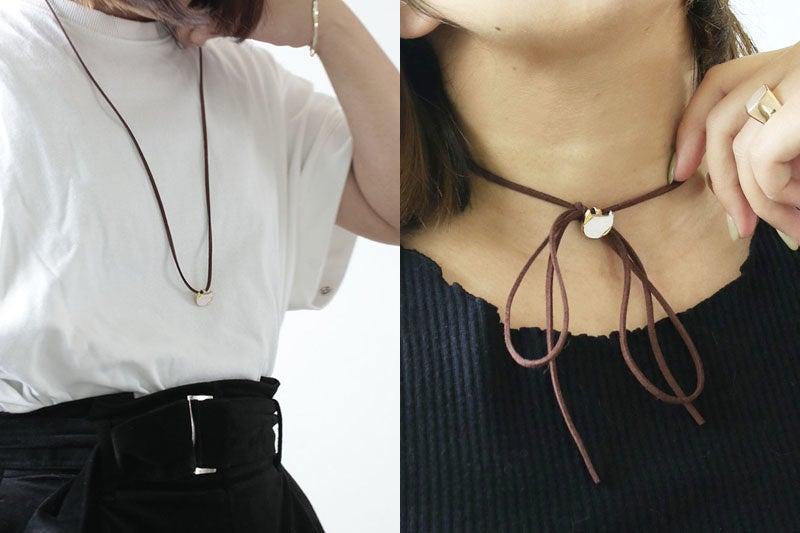 ※画像のシルバーチェーンはスタッフの私物です。商品についているのは革紐となります。
