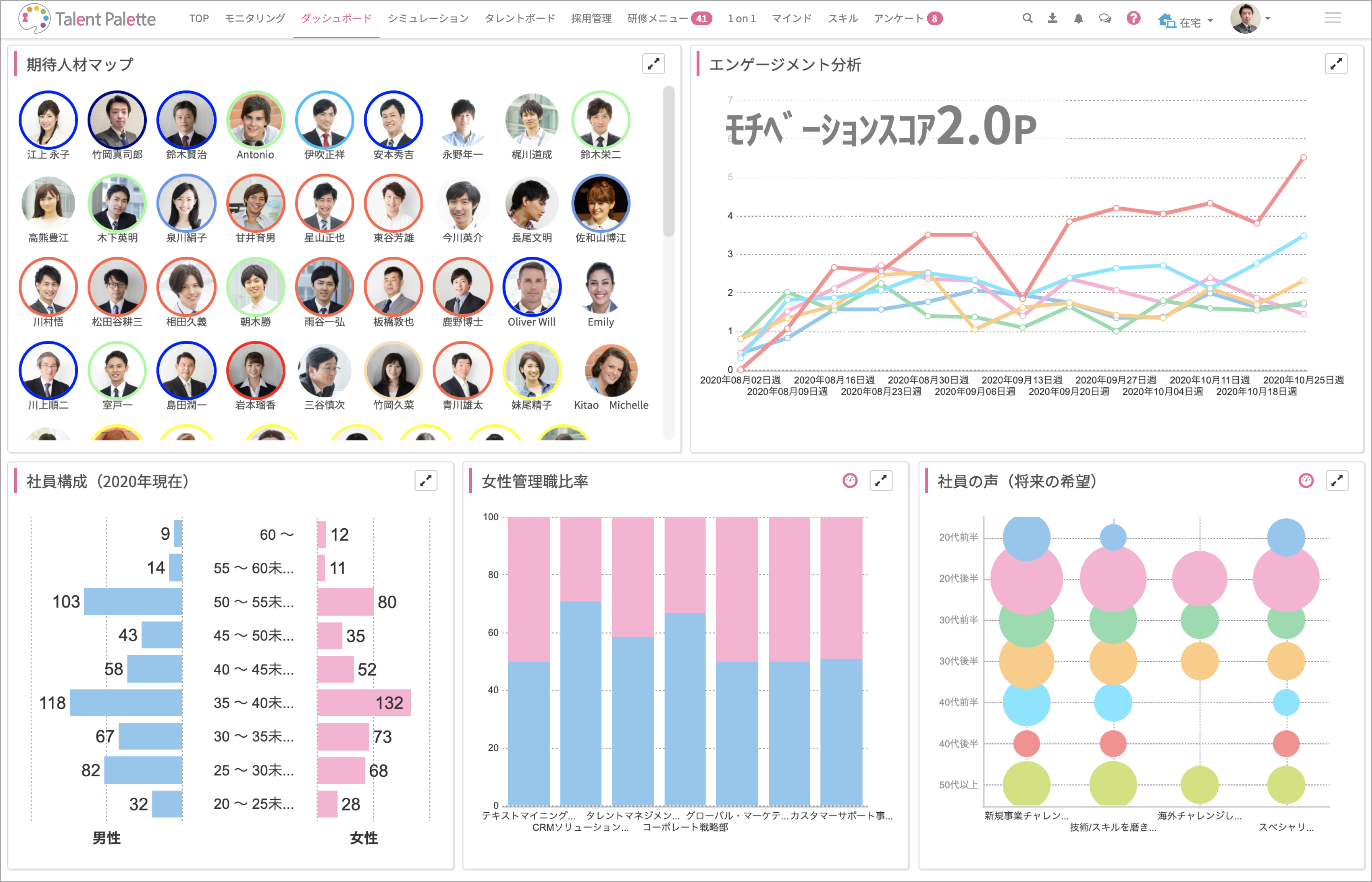 「タレントパレット(https://www.talent-palette.com/)」は、人材戦略に必須となる採用から育成、配置、評価、抜擢・活躍までを一気通貫で行い、人材情報を活用した科学的人事戦略を実現するタレントマネジメントシステムです。当社はこれまで4,000社超のビッグデータ活用支援を行ってきた実績があり、そこで磨き上げたデータ活用技術のノウハウを活かしています。タレントパレットの導入法人数は約2,800社を超え(契約社数1,283社、23年6月末時点)従来は管理するのみに留まっていた人材情報を分析し、そのデータを網羅的に活用することで経営層の意思決定を後押しします。具体的には人事情報、経歴、スキル、マインド(適性)、社員の希望や想い、日々のモチベーションやエンゲージメント、ヘルスケア(健康)までのデータを集約・活用することができます。これらのデータを分析することにより異動シミュレーションや研修まで含めた人材育成、テキストマイニングを活かした離職予兆の抽出、採用ミスマッチ防止、人的資本KPIのモニタリングなど、あらゆる人事戦略においてデータを活用した科学的人事戦略を実現します。