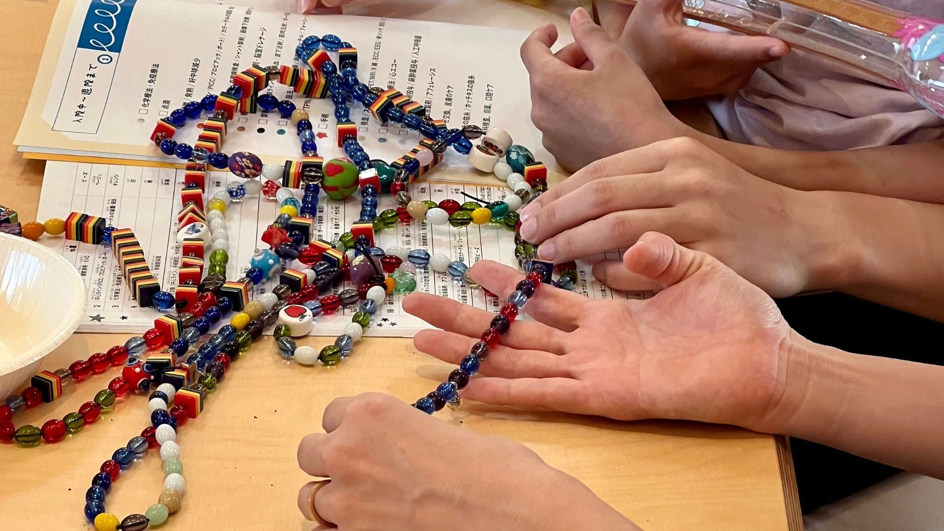子どもたちは治療の過程を色とりどりのガラスビーズで記録します。例えば、輸血したときは赤いビーズ、髪が抜け始めたときは顔のビーズなど、処置や治療ごとに決められたビーズを、ビーズ大使である医療スタッフと会話をしながら子どもが自ら繋いでいきます。