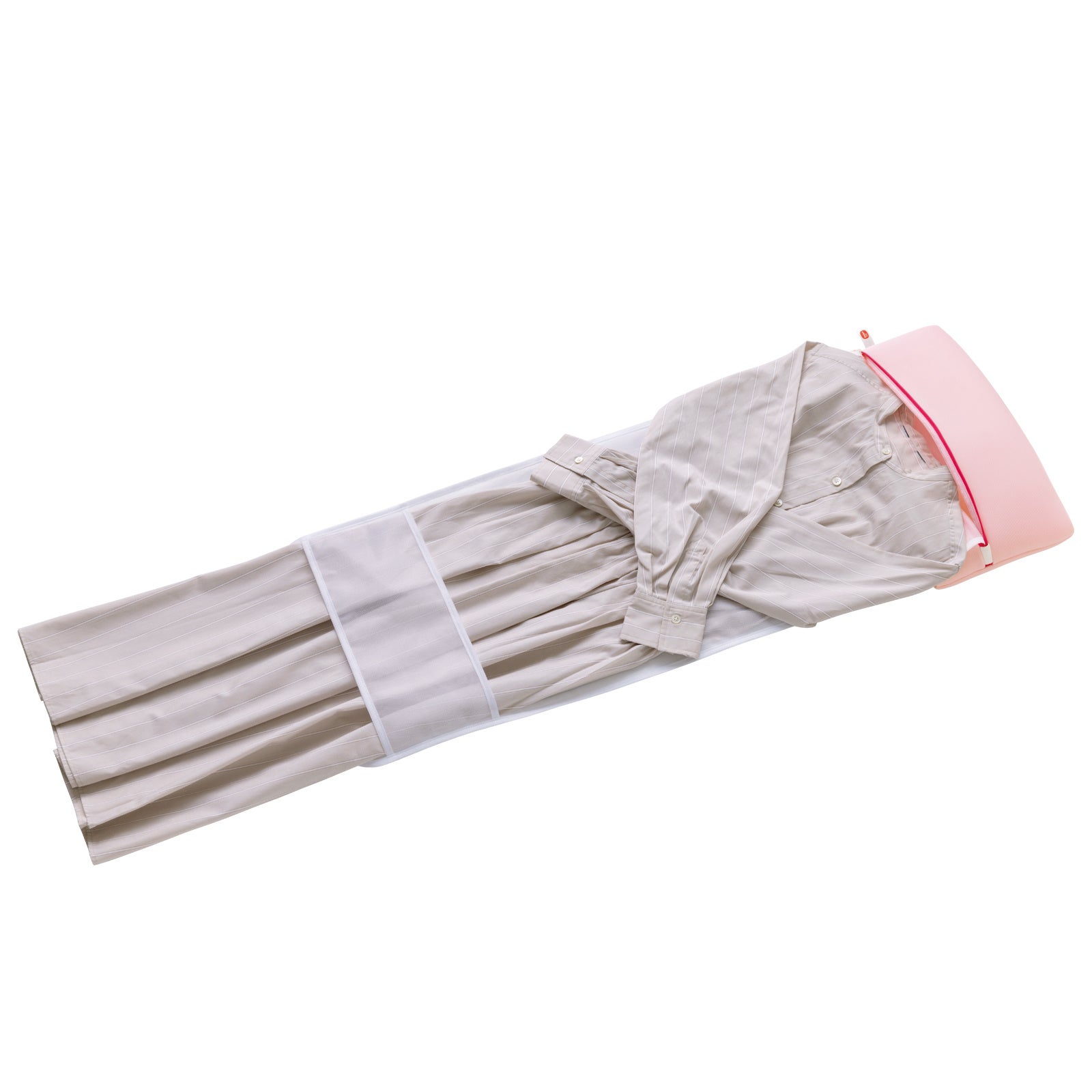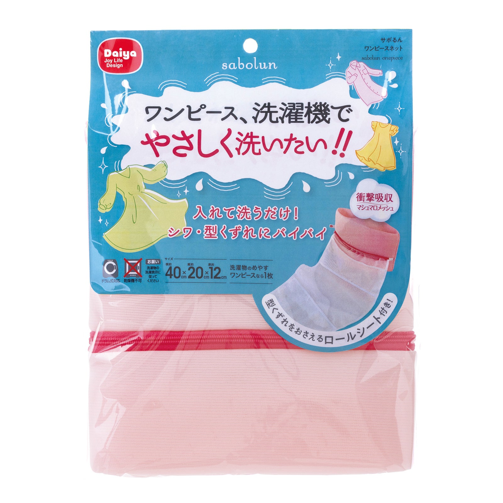 『サボるん ワンピースネット』は、付属のロールシートと一緒に畳んで入れるだけでワンピースの型くずれやシワを抑える、おしゃれ着専用の洗濯ネットです。生地には厚さ約3mmの立体メッシュ生地「マシュマロメッシュ」を採用し、糸くずの侵入をおさえながら大切なおしゃれ着を洗濯機による衝撃から守ります。マチが付いているので薄手のワンピースから厚手のものまで、また、ロングスカートや女性用スラックスのお洗濯にも最適です。ファスナーの引き手はつまみやすく、使いやすさにこだわったファスナーです。