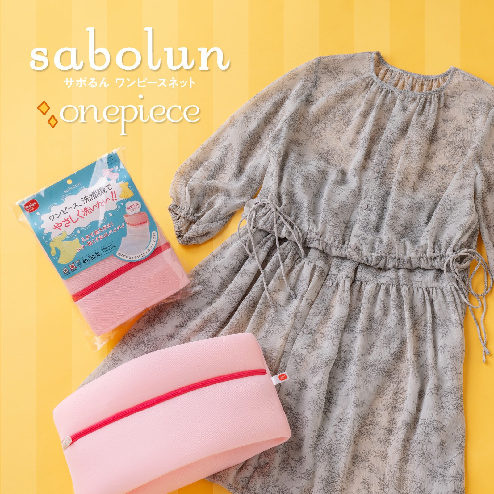 ファッションと洗濯に関するアンケート調査※ではおしゃれ着のケア方法として「洗濯機で洗う」と答えた人が半数以上を占めていました。一方で、おしゃれ着洗いをする際の困りごととして「型崩れしたり縮んだりする」、「正しい洗い方が分からない」があがっています。一枚でコーディネートが完成するワンピースは、着回しや重ね着もできるため気温の変わりやすい春夏に人気のアイテムですが、シワのつきやすい生地、プリーツやフリルの付いたものなど洗濯方法に戸惑う形や素材も多く悩んでしまいます。そこで、ダイヤ株式会社は、ワンピースを洗濯機でやさしく洗える『サボるん ワンピースネット』を発売します。