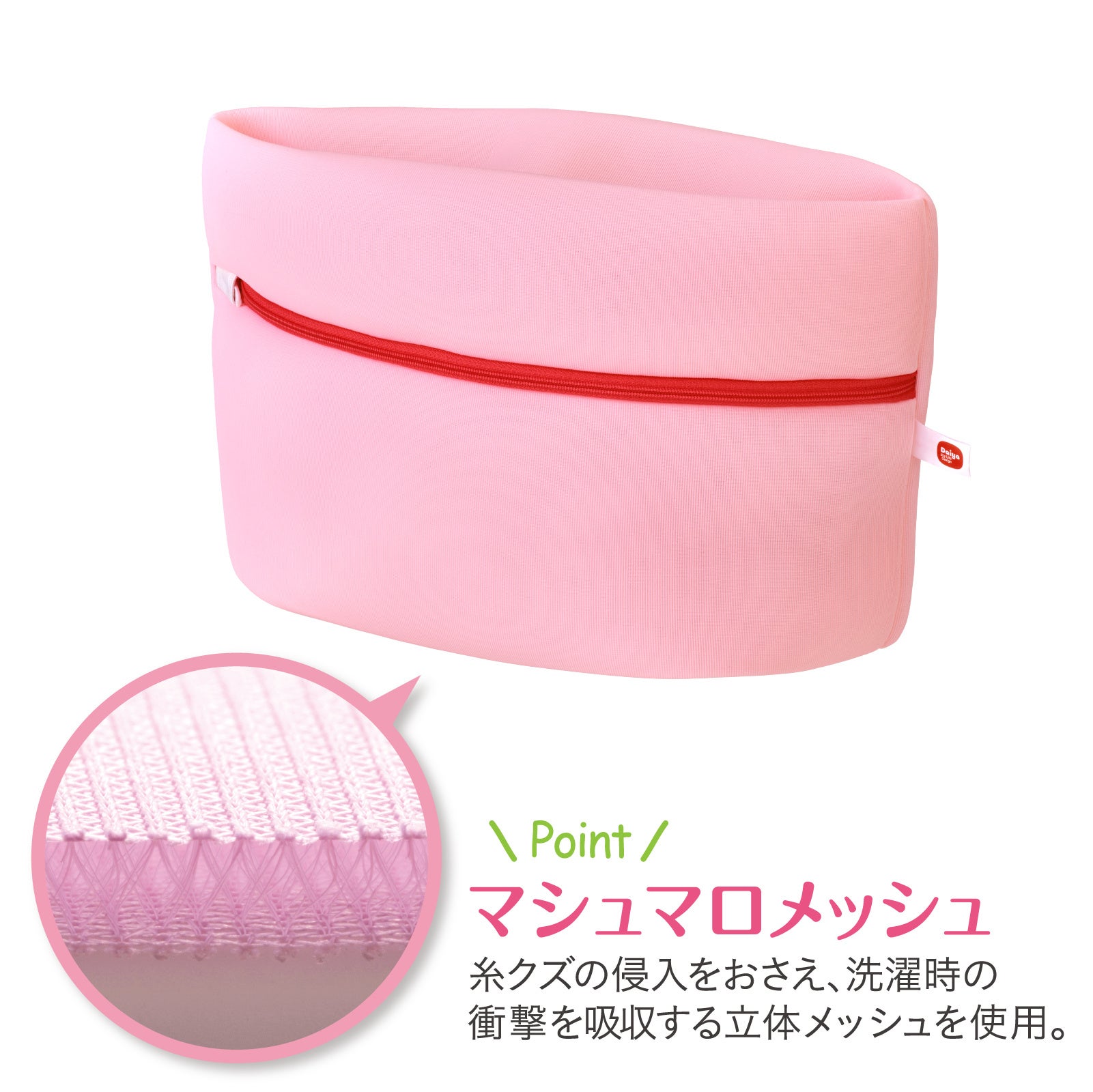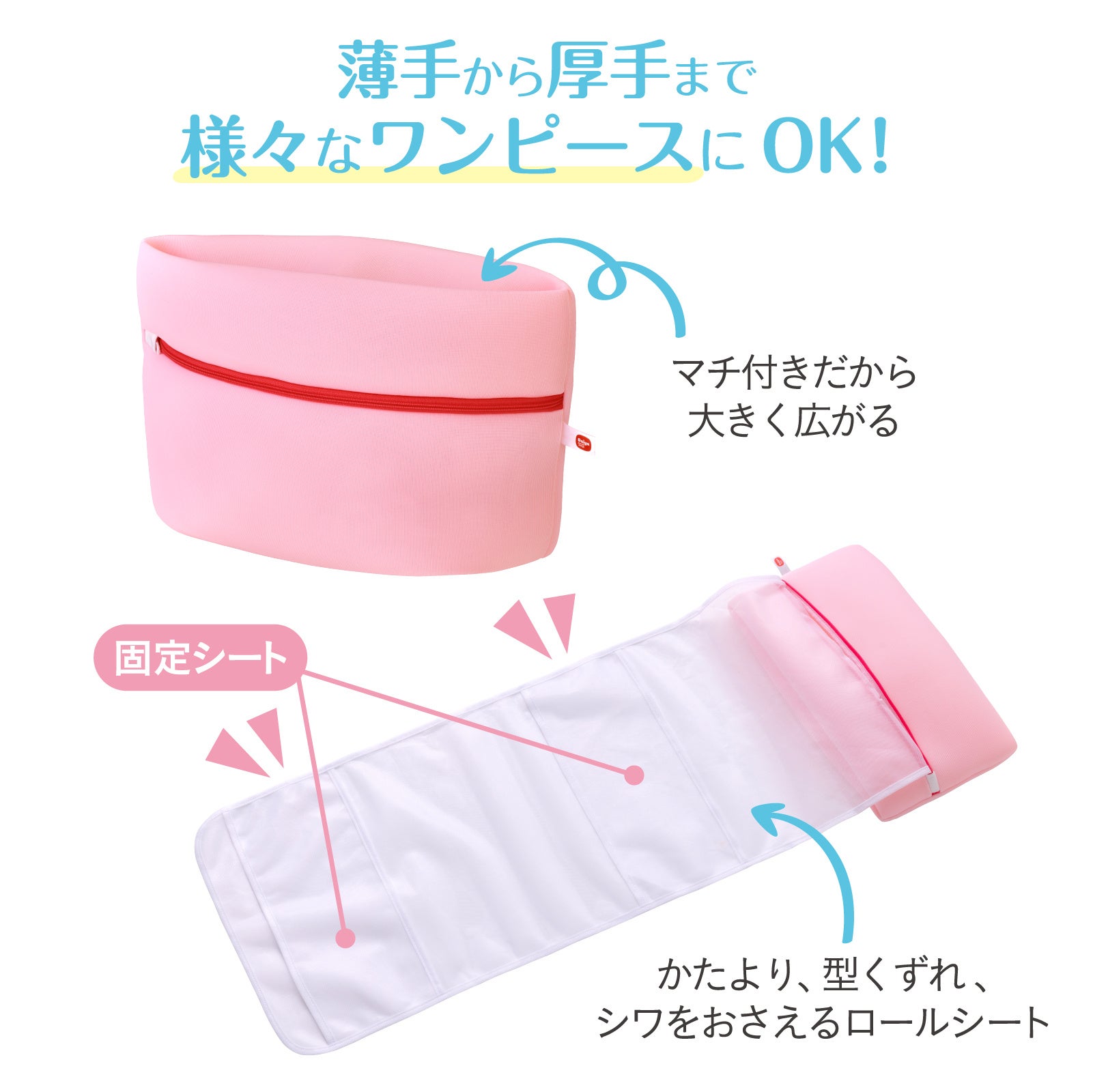 マチが付いているので、薄手のものから厚手のものまで様々なワンピースに対応できます。立体メッシュ生地「マシュマロメッシュ」がお手入れに悩む素材や装飾の付いたワンピースを洗濯機の衝撃から守ります。