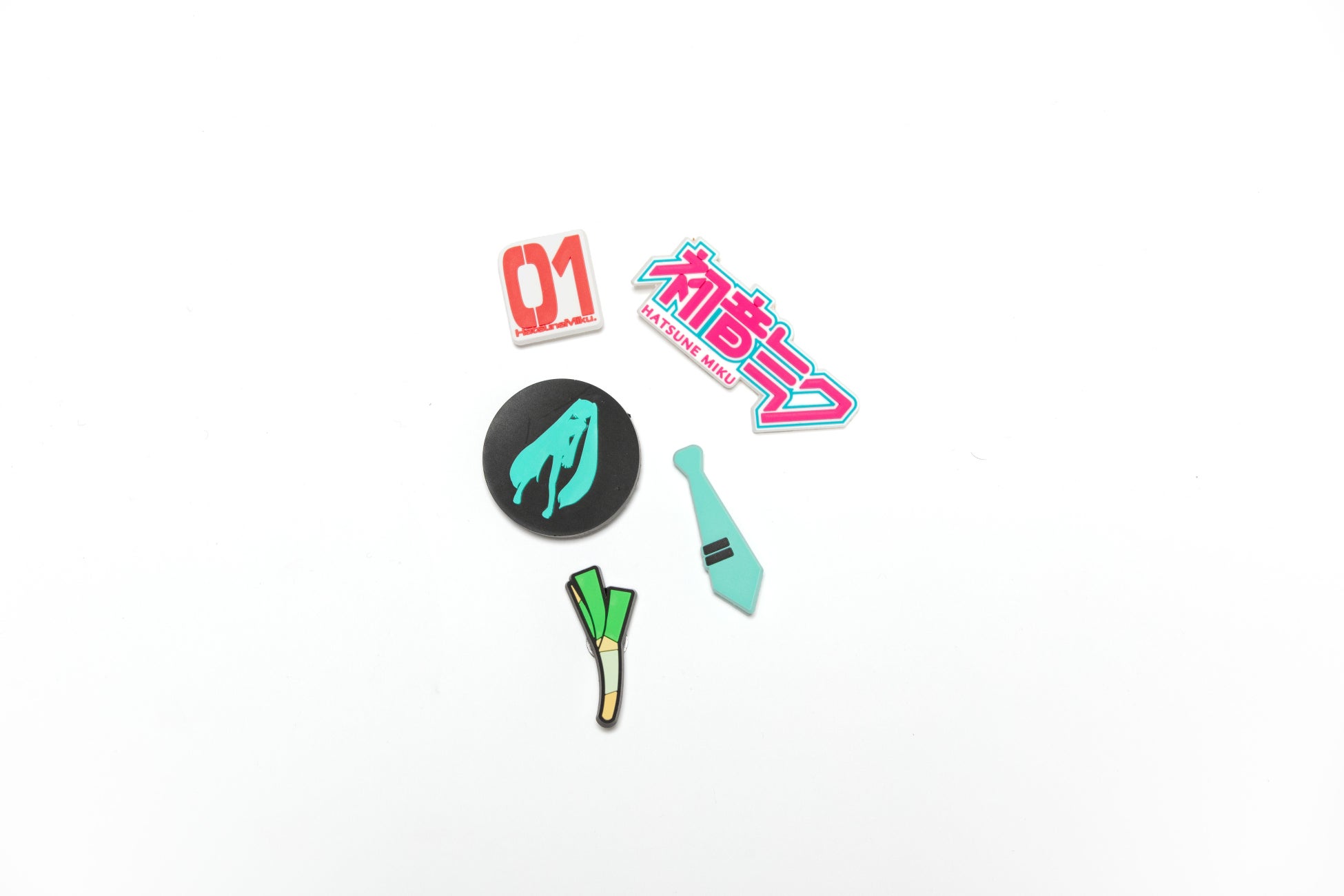 ジビッツ™ チャームとは、様々なデザインを取り揃えた、クロックスのシューズの穴に取り付ける為のカスタマイズアイテムです。今回のコラボレーションでは、ロゴや、初音ミクのシルエットをはじめ、ネクタイやネギ、初音ミクの左腕に施されている「01」など、初音ミクにゆかりのあるデザインを採用した5種類のデザインが1セットになっています。