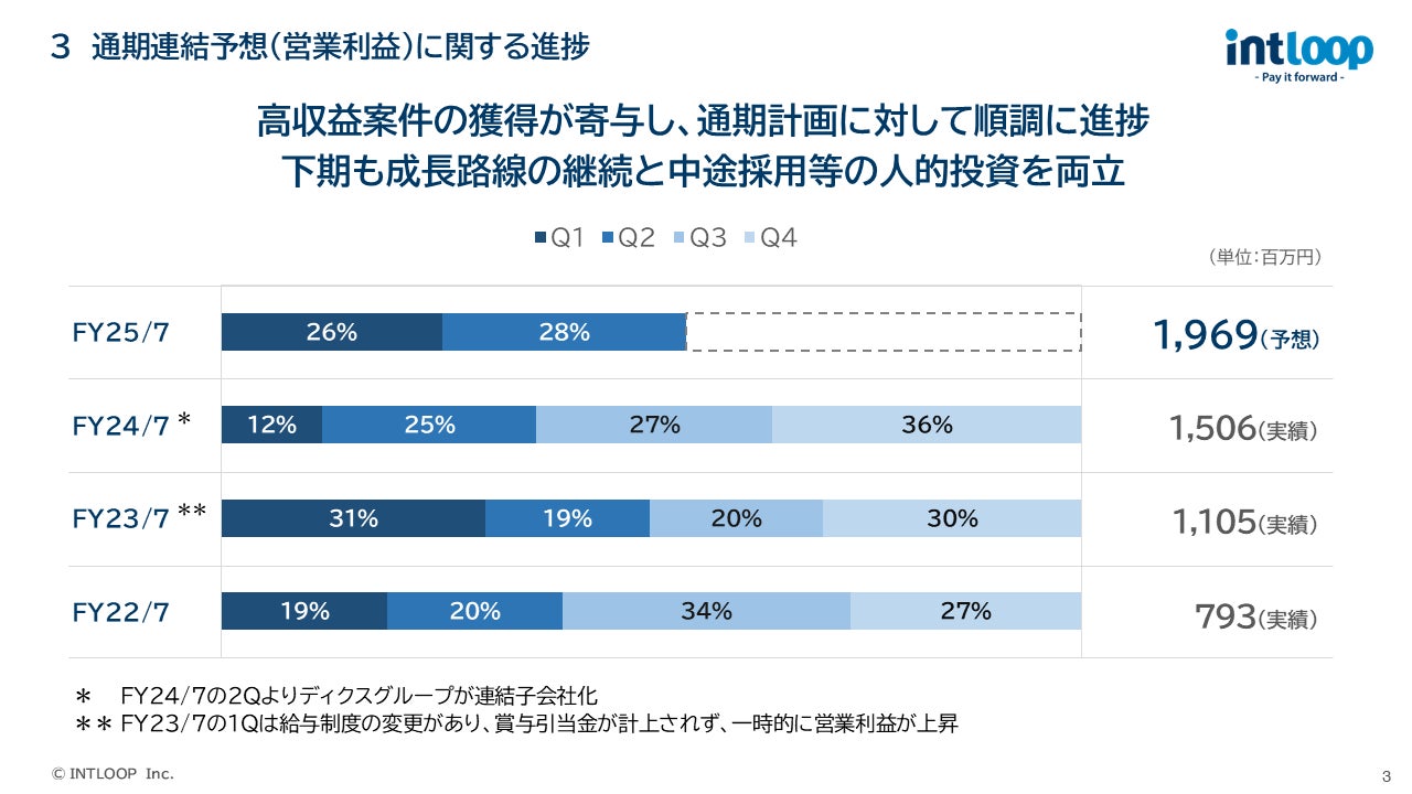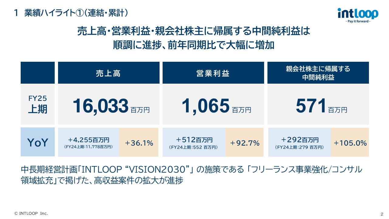 背景には、2024年9月13日に発表した中長期経営計画「INTLOOP‟VISION2030”」の施策、 「フリーランス事業強化/コンサル領域拡充」で掲げた高収益案件の獲得が進捗したことが挙げられます。また、これにより粗利率が改善いたしました。