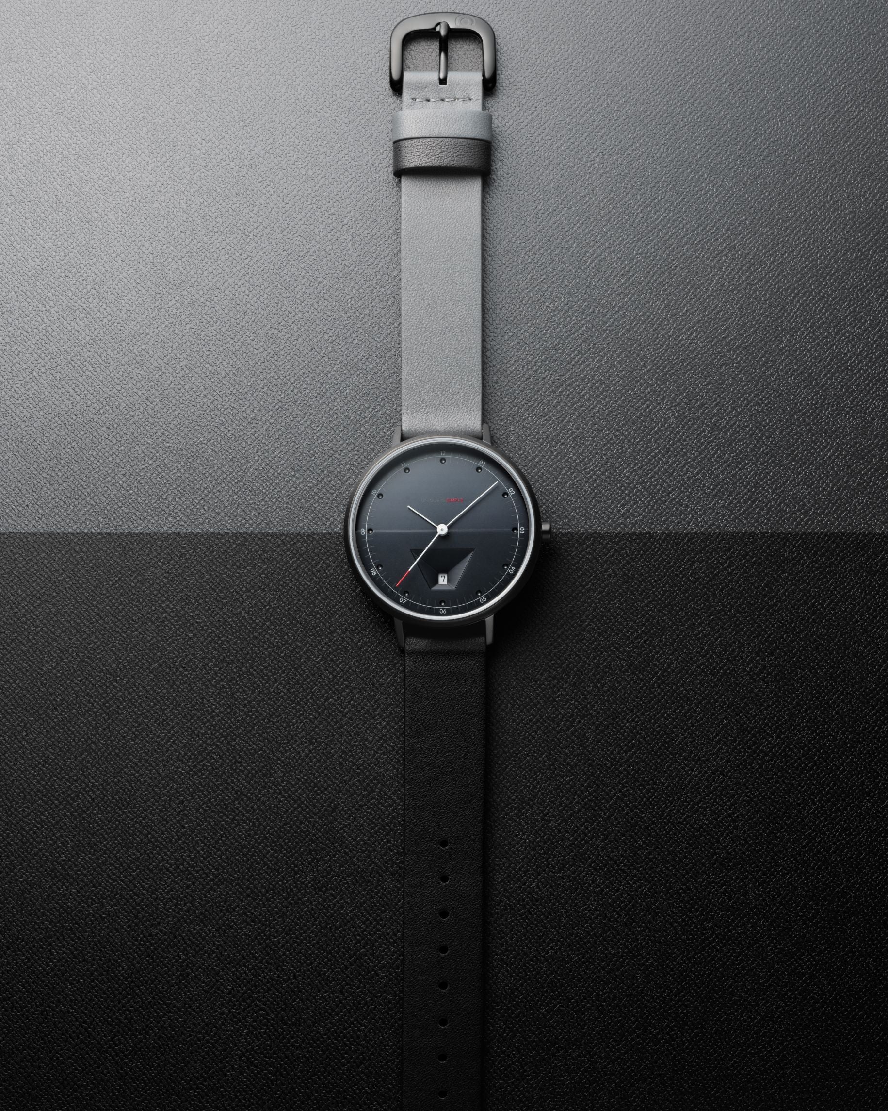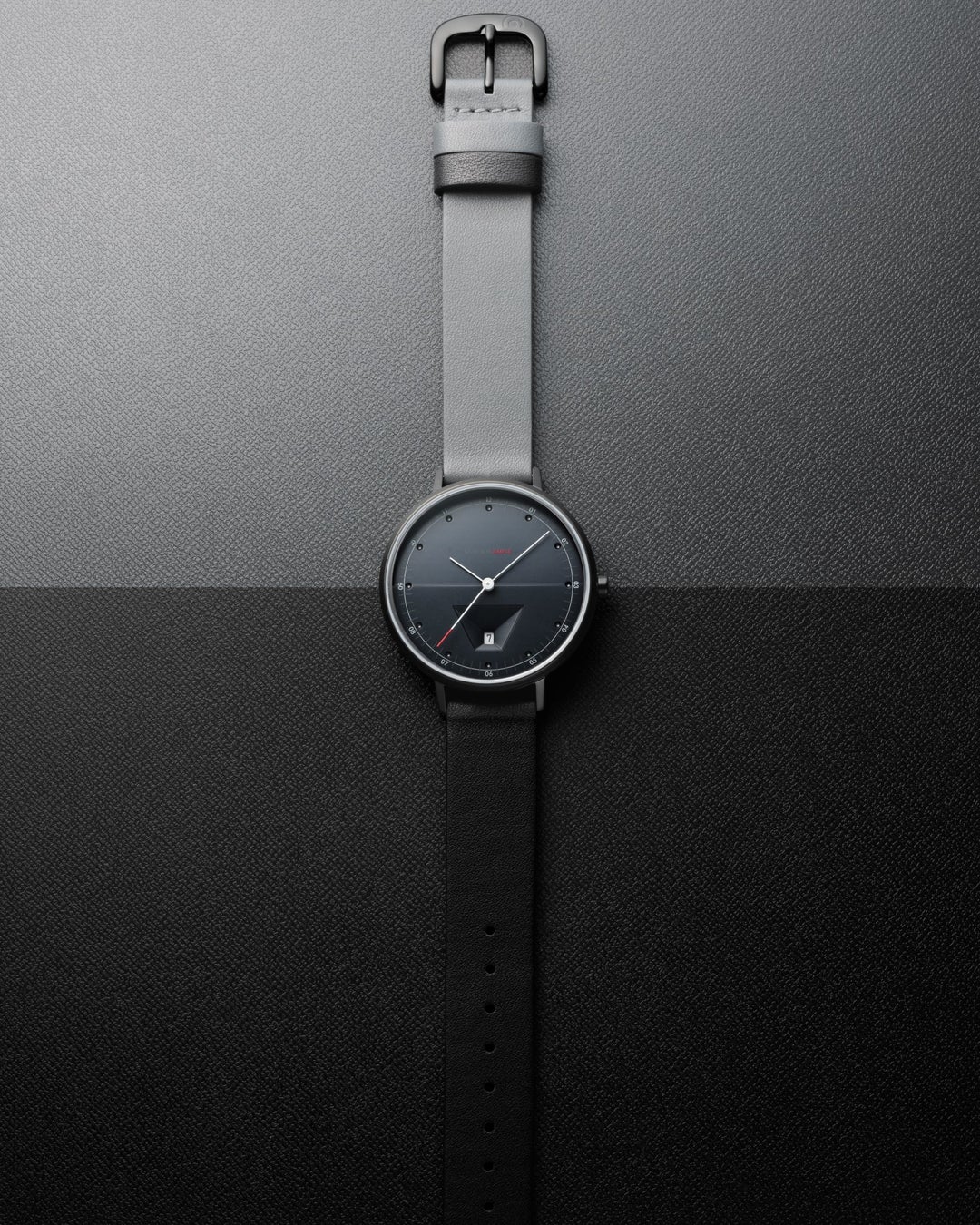 また、ブラックIP加工を施したケースを使用したモデル(TS2003C)は、上下のベルトの色に変化を持たせています。傾斜のある文字盤が光の当たり方によって、12時側と6時側との色味が違って見えるのを再表現しました。