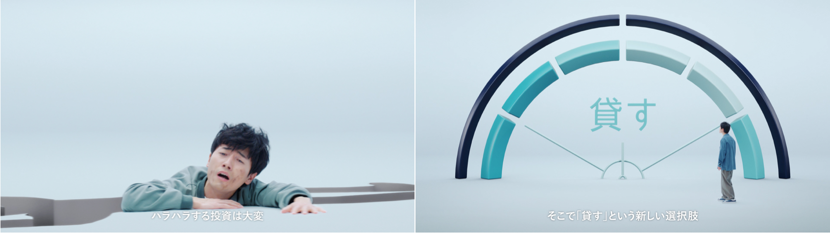 本CMは、資産運用を検討しているけれど、仕事や家事に忙しく投資の勉強をする時間がとれない、また、値動きのある金融商品にハラハラすることが負担に感じている生活者に向けて、「貸す」という資産形成の新たな選択肢を提示する内容となっております。