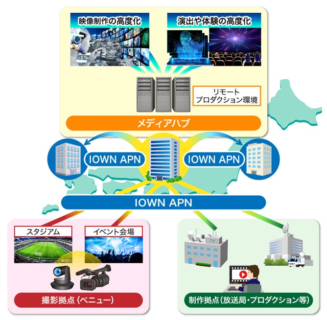 今回、NTT西日本グループ※2はIOWN APNを活用した放送業界DXの取り組みの一環として、大阪・関西万博会期中に複数の放送局が共同利用可能なリモートプロダクション※3設備を提供し、在阪放送局と共同で実証実験を実施すると共に、IOWN APNを活用したリモートプロダクションの普及拡大に取り組んでまいります。本取り組みによって、番組制作ワークフローの効率化と設備コスト削減の実現をめざします。