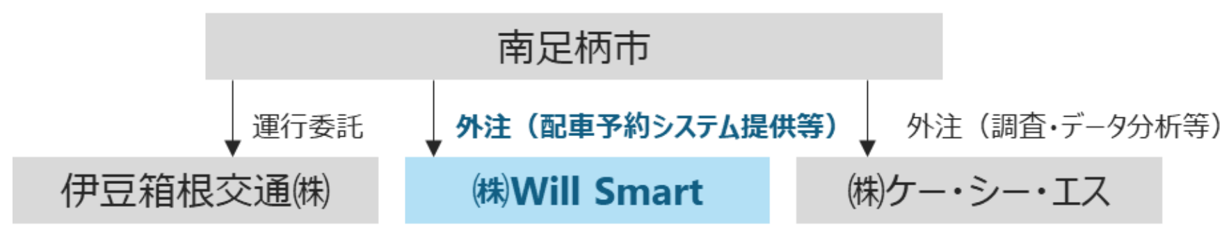 南足柄市を主体に、伊豆箱根交通が運行、Will Smart がシステム提供と運用支援を、ケー・シー・エスが調査・データ分析等を担当。