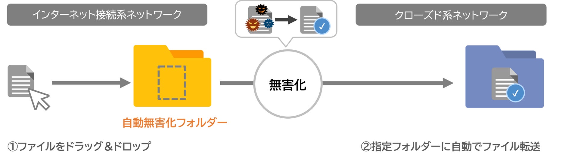 | 主なポイント | フォルダーへドラッグ&ドロップするだけで、安全に別ネットワークのフォルダーへのファイル転送を実現(注1) |