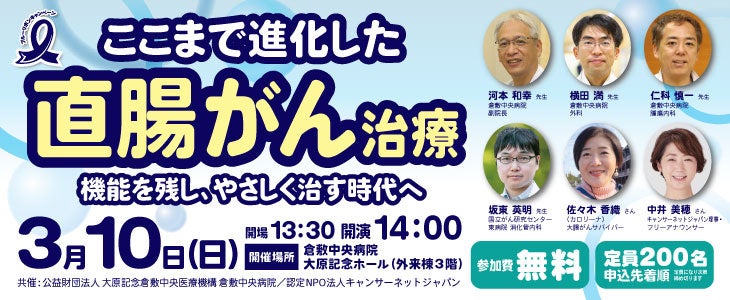 認定NPO法人キャンサーネットジャパン(東京都文京区 理事長 岩瀬哲 以下キャンサーネットジャパン)は、ブルーリボンキャンペーン*1の一環として、公益財団法人 大原記念倉敷中央医療機構 倉敷中央病院(岡山県倉敷市 院長 山形専 以下倉敷中央病院)との共催で「ここまで進化した直腸がん治療~機能を残し、やさしく治す時代へ~」を開催いたします。