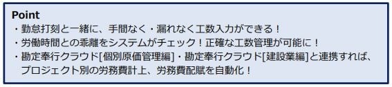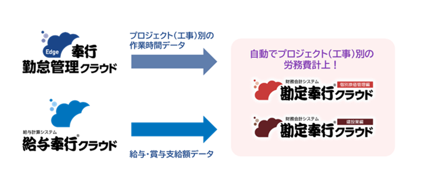 また、『勘定奉行クラウド[個別原価管理編]』・『勘定奉行クラウド[建設業編]』と連携することで、プロジェクト別の労務費計上・労務費配賦を自動化でき、工数管理から個別原価計算まで手作業なく一気通貫で実現することができます。
