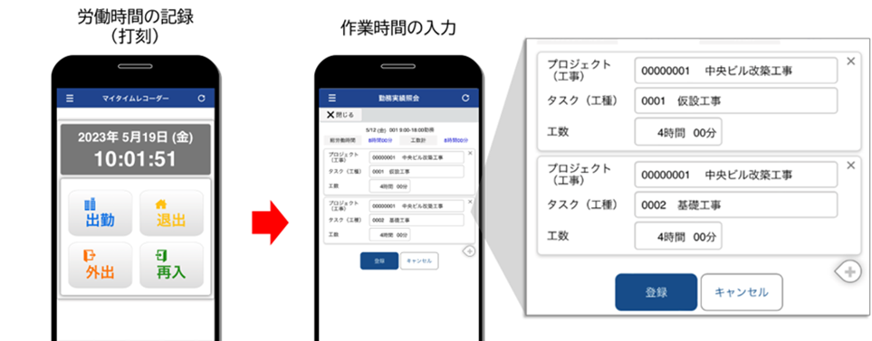 日々の打刻と一緒に、勤怠管理システム上で作業時間の入力が行えます。外出先でもスマートフォンを使って打刻し、そのまますぐに作業時間を記録できるため、入力忘れがなくなります。