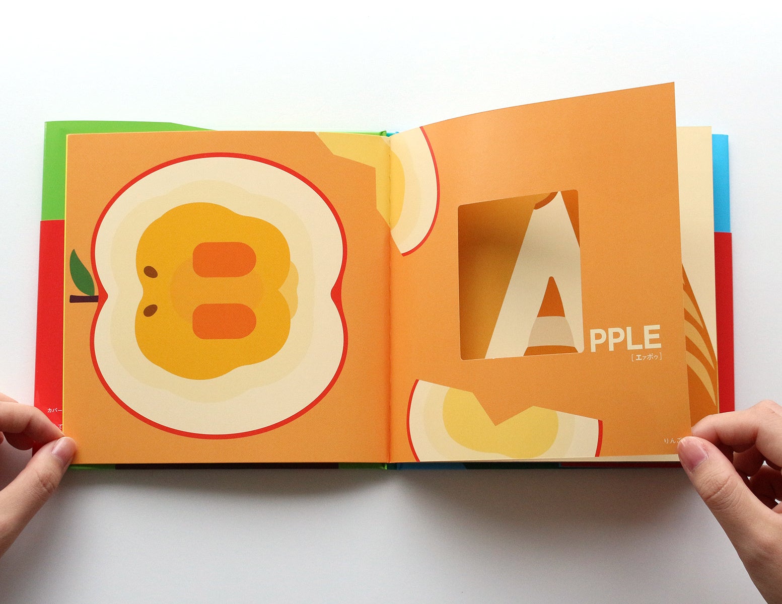 最初のページはこちら。左側にりんごの絵、右側に「A」(APPLE)の文字が書かれています。Aの文字は、穴から覗いています。