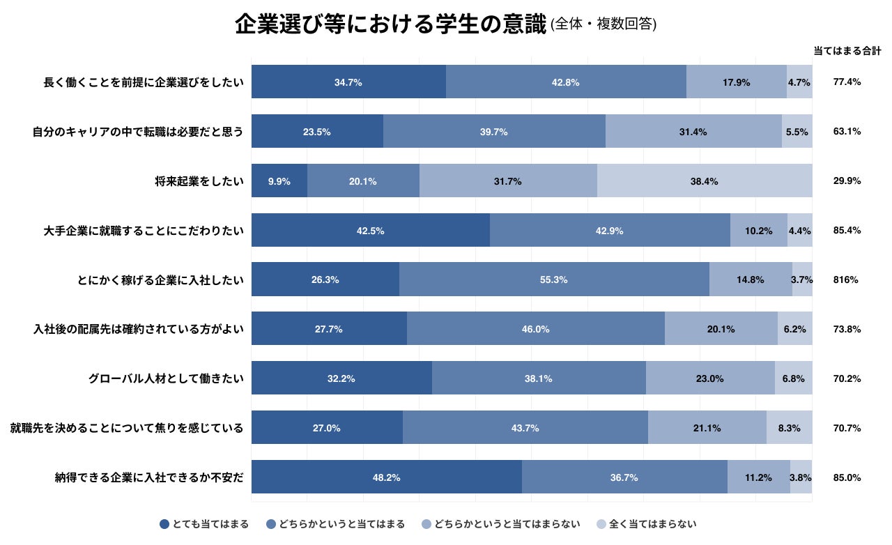 企業選びにおける学生の意識として、多くの学生が「長く働くこと」を前提に企業を選び、また大手企業への就職を重視する傾向が見られた。これは、安定した環境でキャリアをスタートさせたいという志向の表れと考えられる。一方で、将来のキャリアにおいて「転職は必要だ(63.1%)」「将来起業をしたい(29.9%)」と考える学生も一定いる。この背景には、最初の就職先で安定した基盤と成長の機会を確保しつつも、変化の激しい時代に対応するために将来のキャリアパスを柔軟に捉え、自身の市場価値を高めていきたいという、学生の戦略的なキャリア観があると考えられる。