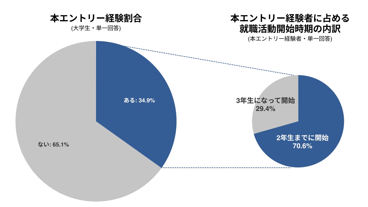 本エントリー(内定につながる本選考、採用直結のインターンへのエントリー)をしたことがある学生の割合は34.9%で、うち、2年生(2025年3月)までに就職活動を開始した学生が7割以上を占める。本エントリーをした時期は2025年4月以降に急激に増加する傾向が見られた。