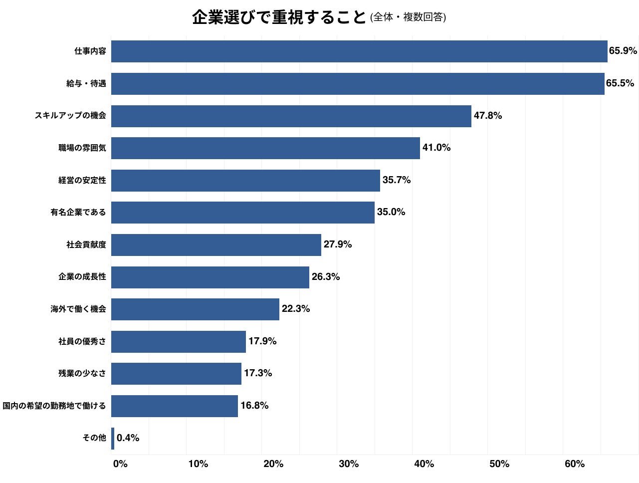 企業選びで重視することは、「仕事内容」「給与・待遇」の割合が高く、拮抗している結果となった。次いで、「スキルアップの機会」や「職場の雰囲気」を重視する割合が高かった。