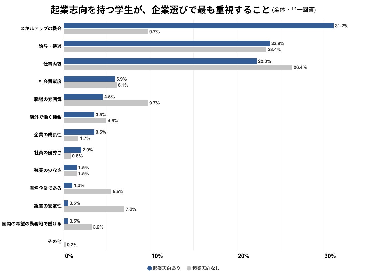 起業志向の学生が企業選びで最も重視することは、「スキルアップの機会」が最も多く、起業志向がない学生と比較して顕著な差が見られた。将来的に起業を考えている層は、自身の成長に直結する経験や能力開発の機会をより優先していると見られる。