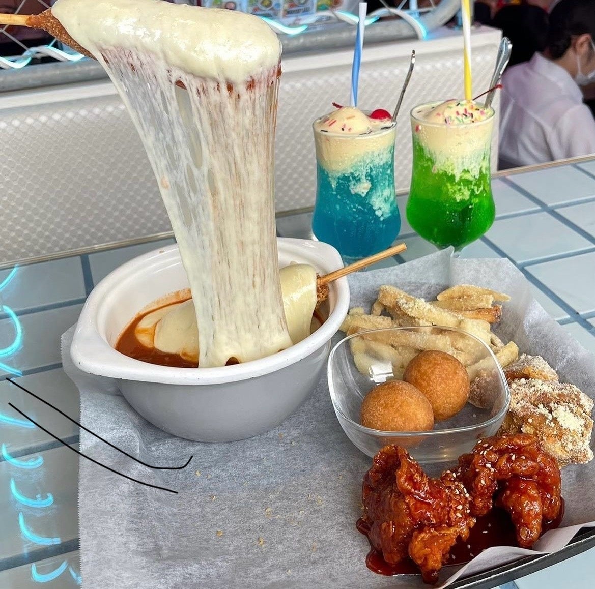 チーズマニマニ(韓国語で「チーズたくさん」)という名前のごとく、チーズボールやチーズハットクなど、チーズをふんだんに使った料理を中心に、韓国のインフルエンサーがよく食べているモッパン動画の食べ物の盛り合わせを食べれると話題です。