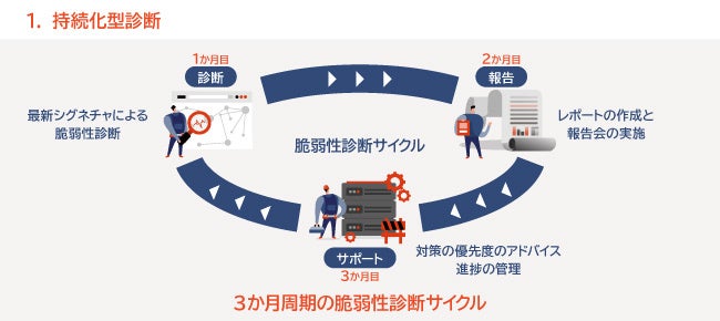 経験豊富なセキュリティエンジニアがサイバー攻撃者の目線に立ち、お客様の環境を診断。一度診断をするだけでは終わらず、周期的に「診断・報告・サポート」のサイクルをまわすことで、日々生まれ続ける新たな脆弱性も見落としません。