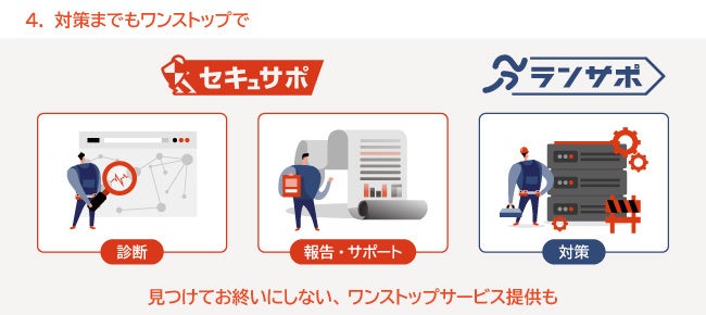 セキュサポと同時に網屋提供のクラウド情シスサービス「ランサポ(※)」をご利用いただくことで、脆弱性診断サービスで発⾒された事象に対する既存システムへの対策まで、網屋がワンストップでご提供いたします。