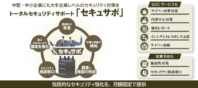 トータルセキュリティサポート「セキュサポ」は、中堅・中小企業のセキュリティ強化をトータル支援するクラウドセキュリティサービスです。サイバー攻撃・内部不正の監視や事件時の原因特定、調査など、企業のセキュリティ対策に求められる包括的な対応を月額固定料金で提供します。