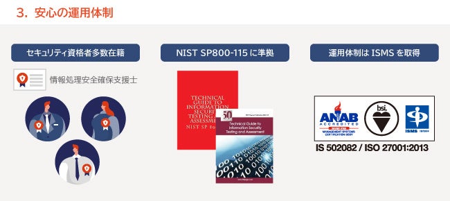 国際標準ガイドラインNIST SP800-115に準拠し、セキュリティ資格保有者が診断を実施するため、高い信頼性を担保します。また、ISMS(情報セキュリティマネジメントシステム)の基準に則った運用体制で適切にお客様の情報を取り扱います。