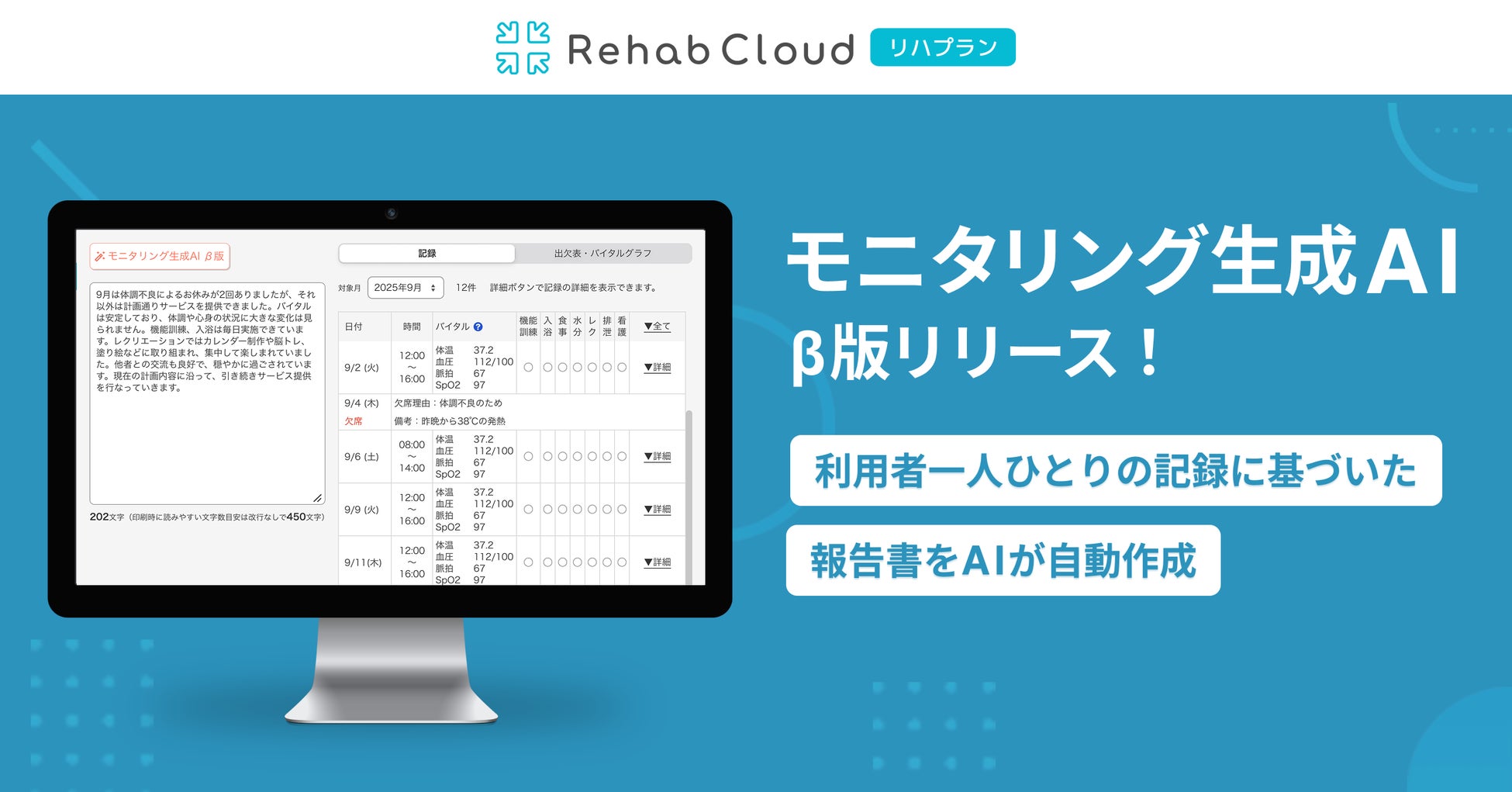 科学的介護ソフト「Rehab Cloud(リハブクラウド)」を運営する株式会社Rehab for JAPAN(本社:東京都千代田区、代表取締役:大久保 亮 以下「当社」)は、生成AIを活用した通所介護モニタリング報告文章自動作成機能「モニタリング生成AI β版」をリリースいたしました。