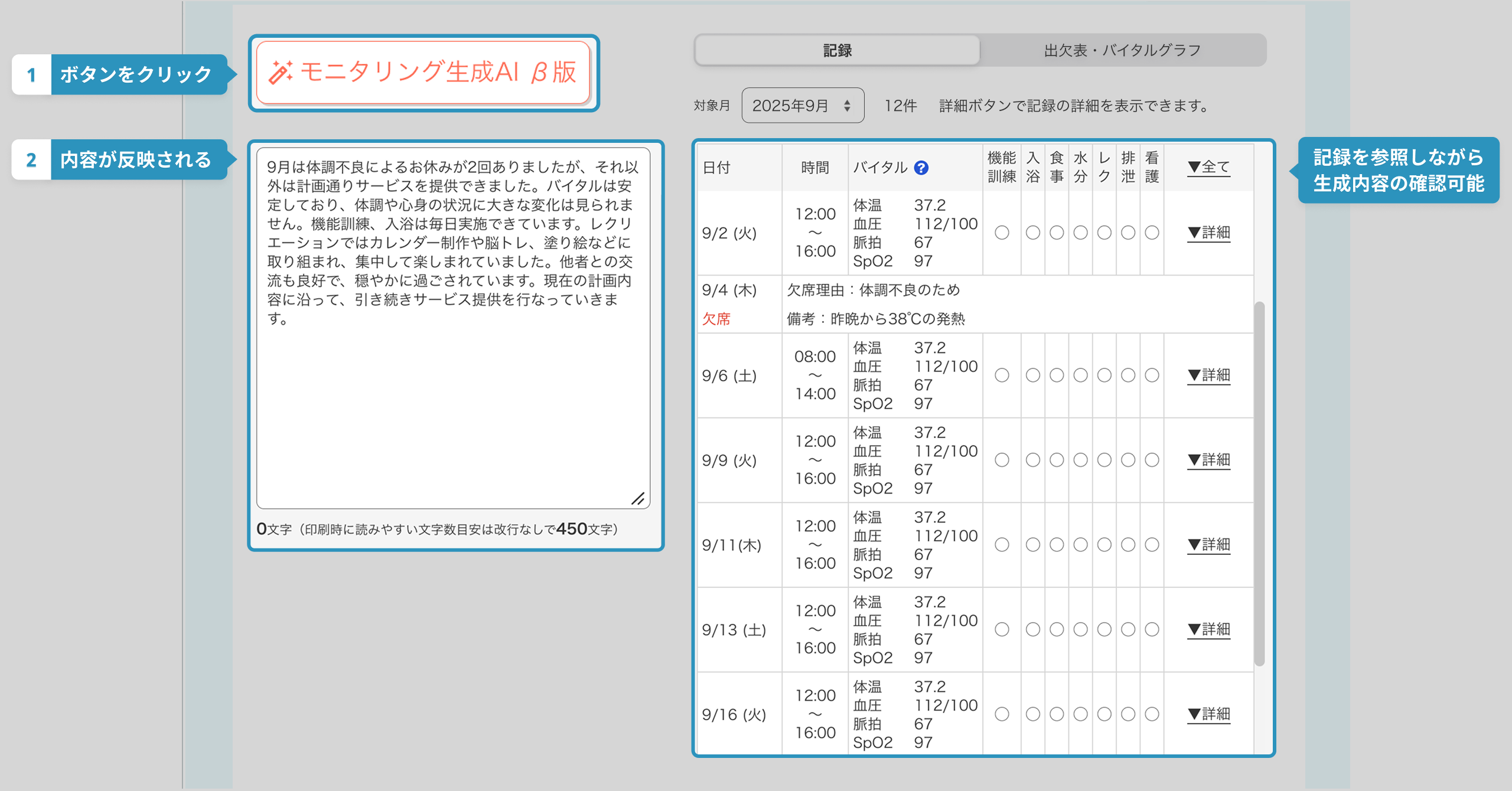 また、モニタリング期間中の記録を確認しながら、AIが生成した報告文の確認・修正もスムーズに行って頂けます。