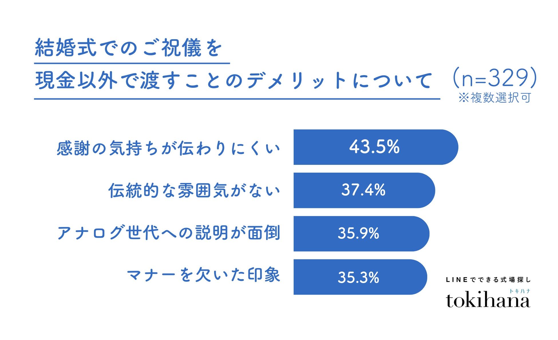 キャッシュレスご祝儀に対するデメリットとしては「感謝の気持ちが伝わりにくい(43.5%)」、「伝統的な雰囲気がない(37.4%)」、「アナログ世代への説明が面倒(35.9%)」、「マナーを欠いた印象(35.3%)」といった項目が上位を占めていました。
