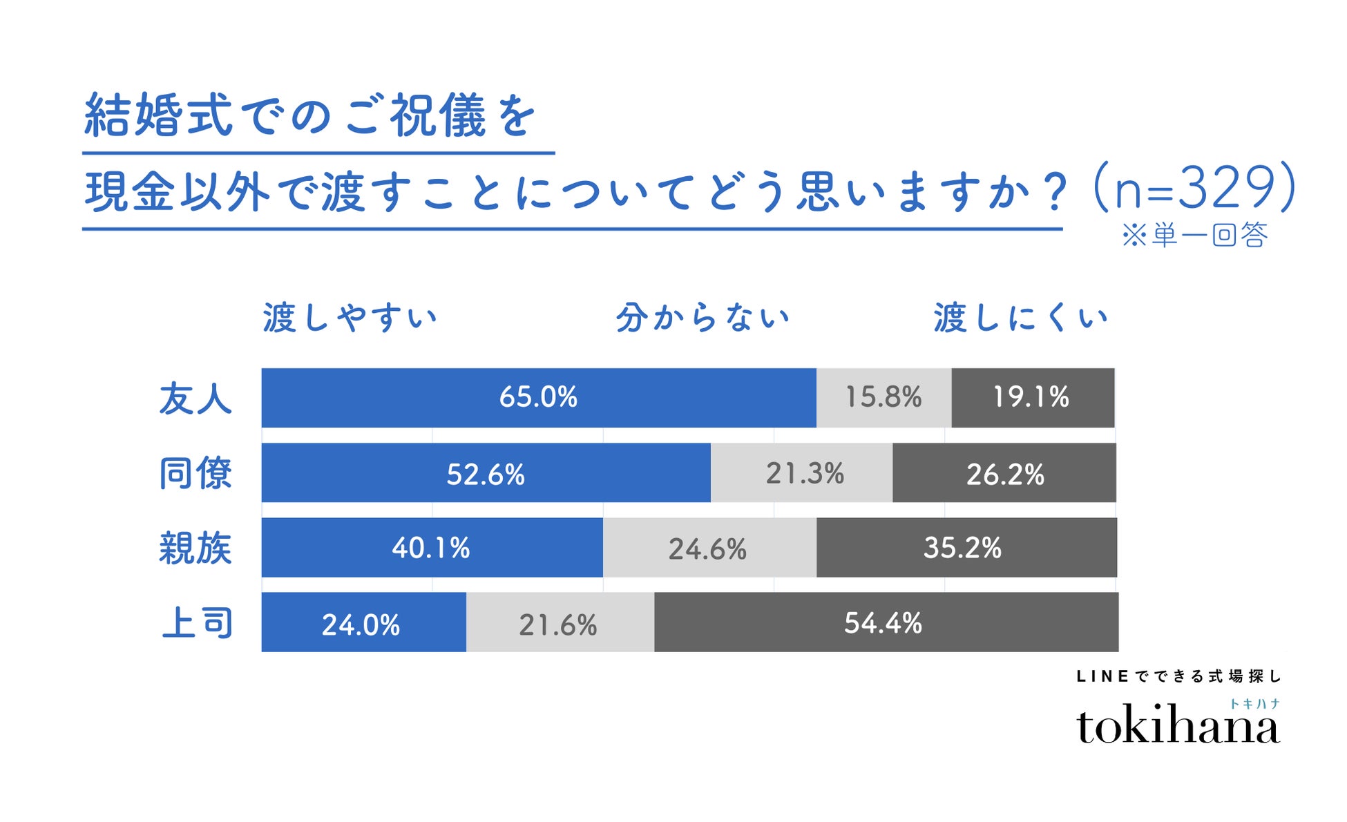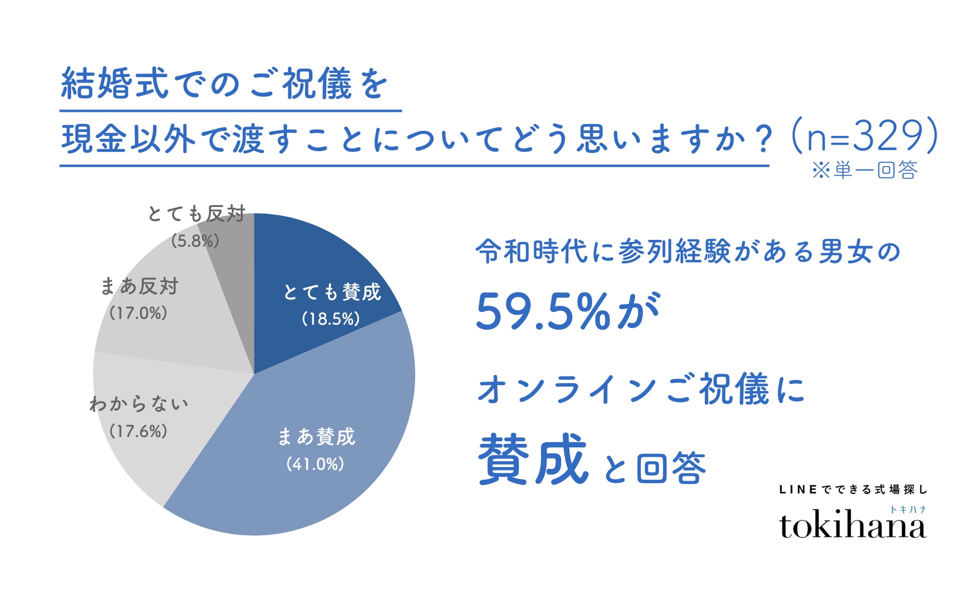 LINEでできる式場探し『トキハナ( https://tokihana.net/ )』を運営する株式会社トキハナ(本社:東京都港区、代表取締役社長:安藤 正樹、以下 「トキハナ」)は、インターネットリサーチにより、令和時代に結婚式に参列した20〜40代の男女329人を対象に調査を行ったところ、「結婚式のご祝儀を現金以外で渡すことに対して賛成」と回答した人は、約6割に達する59.5%にのぼりました。一方で、主催者との関係性による渡しやすさに違いがみられ、ご祝儀のキャッシュレス化が進んでいながらも、伝統とのバランスが重要視されていることが分かりました。