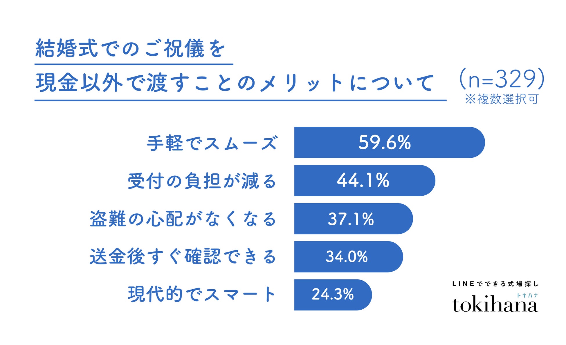 キャッシュレスご祝儀に対するメリットとしては、「手軽でスムーズ(59.6%)」、「受付の負担が減る(44.1%)」、「盗難の心配がなくなる(37.1%)」、「送金後すぐ確認できる(34.0%)」「現代的でスマート(24.3%)」といった項目が上位を占めていました。