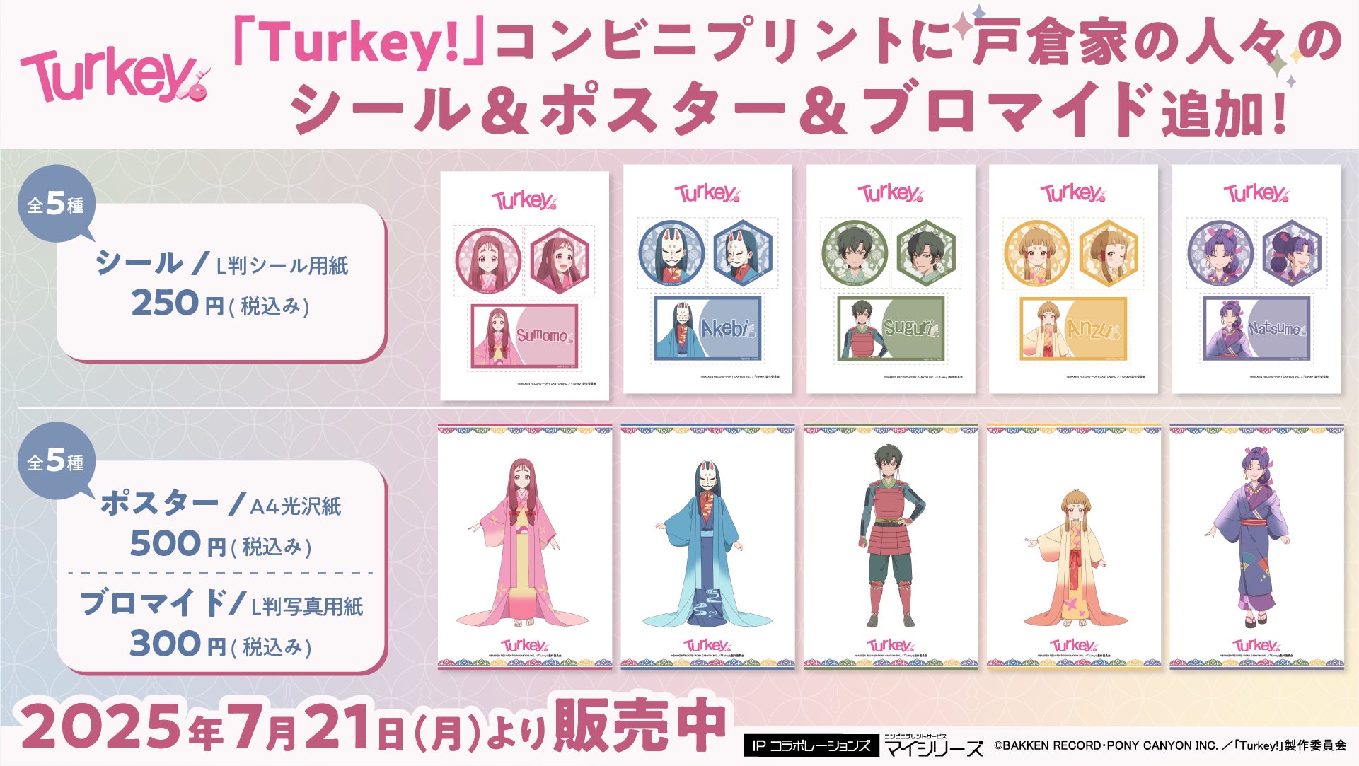 TVアニメ『Turkey!』コンビニプリントは、各キャラクターのポスターやシールなどをコンビニのマルチコピー機でプリントできるサービスです。