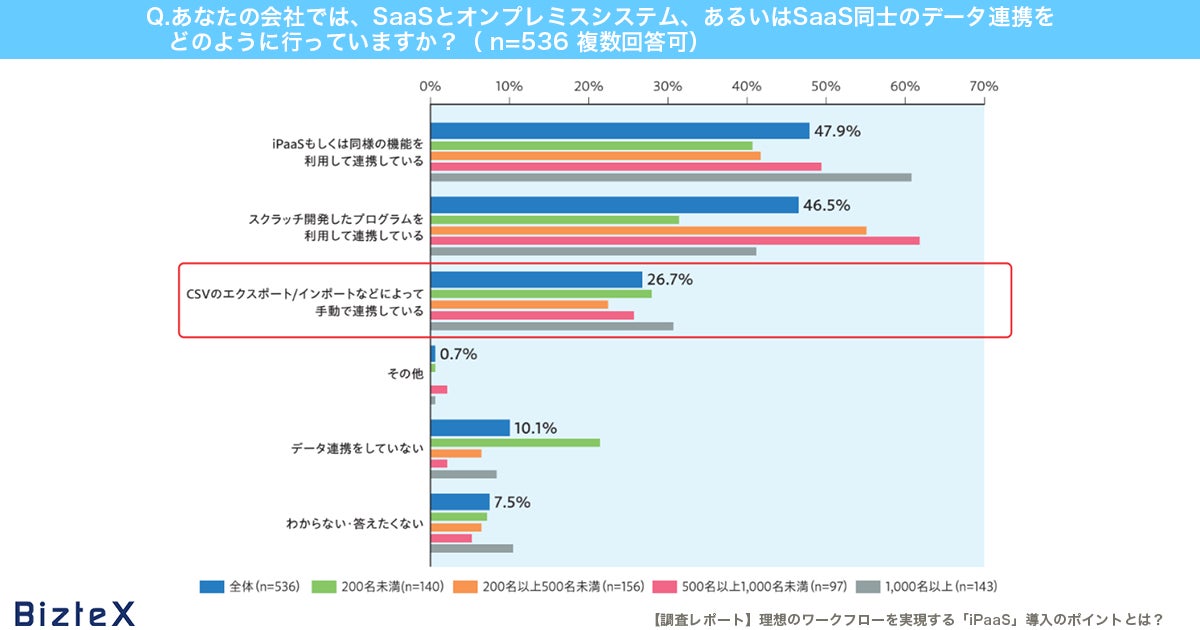 企業が利用しているデータ連携方法として、「iPaaSもしくは同様の機能(47.9%)」「スクラッチ開発したプログラム(46.5%)」「CSVのエクスポート/インポートなどによって手動で連携している(26.7%)」などが挙げられ、データ連携のためにiPaaSを導入している企業は半数に満たず、26.7%の企業が手動でデータ連携をしていることがわかりました。