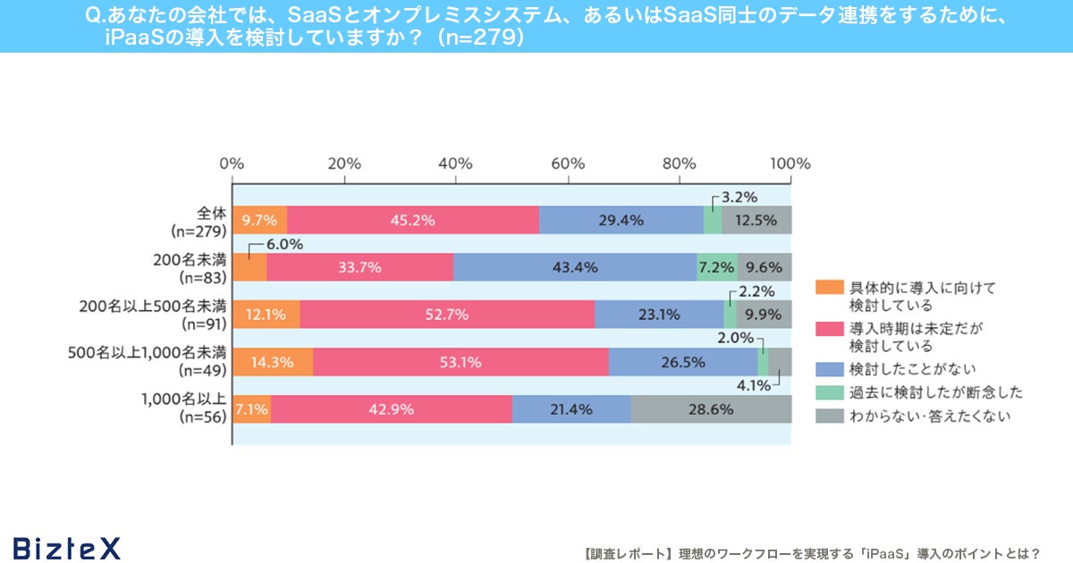 回答全体では、「具体的に導入に向けて検討している」と「導入時期は未定だが検討している」が、合わせて54.9%にのぼり、半数以上の企業がiPaaSの導入を検討していることが明らかになりました。