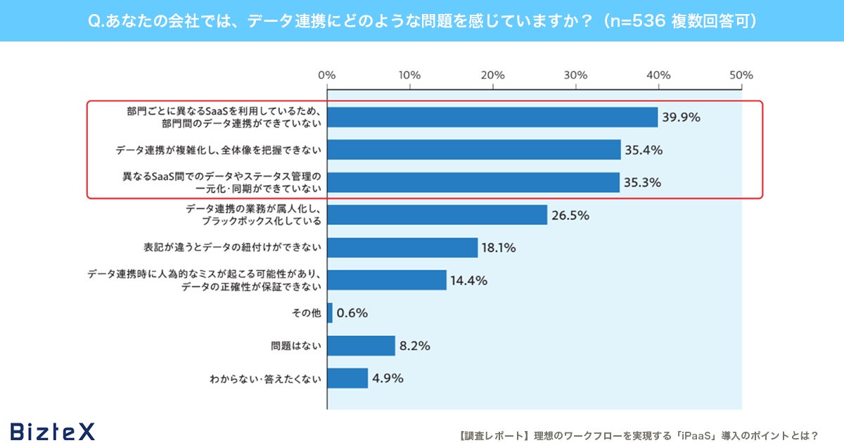 業務自動化SaaSを提供するBizteX株式会社(本社:東京都港区、代表取締役:嶋田光敏)は、企業におけるSaaS(Software as a Service)のデータ連携に関する課題について、SaaS利用企業でITサービスの導入・選定にかかわる業務を担当している536名を対象に、アンケート調査を実施しました。