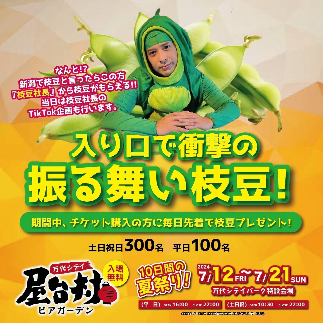 平日先着100名、土日祝先着300名には入り口で「茹でたて」の 茶豆を無料で振る舞います。(前売りチケット、当日チケットをお買い求め頂いたお客様から先着順)