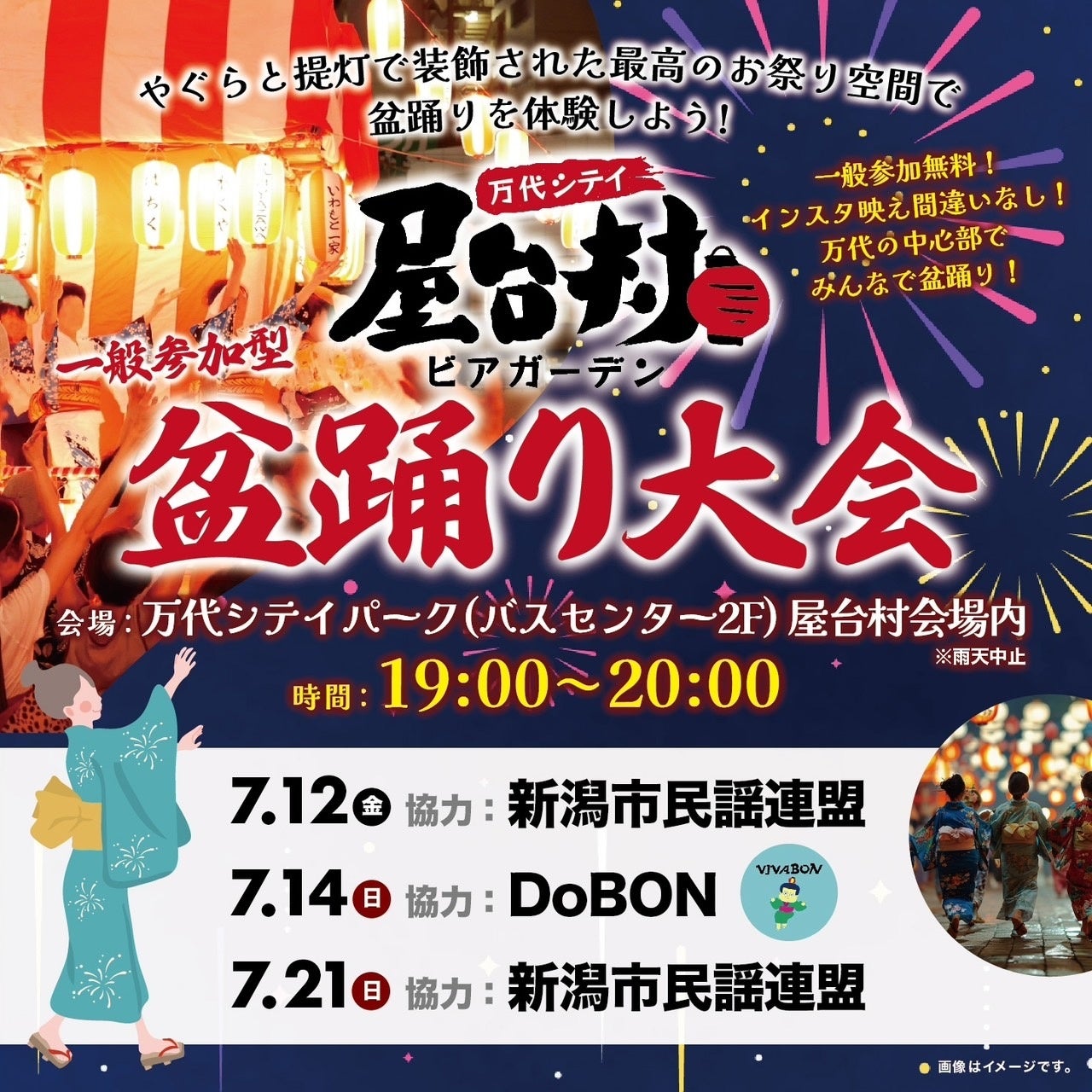 夏の⾵物詩『盆踊り』を盛⼤に開催!新潟市民謡連盟や盆踊りサークル「DoBON」の協力の元巨大やぐらを中心に盛大に繰り広げられる『大盆踊り大会』は写真映え間違いなし!