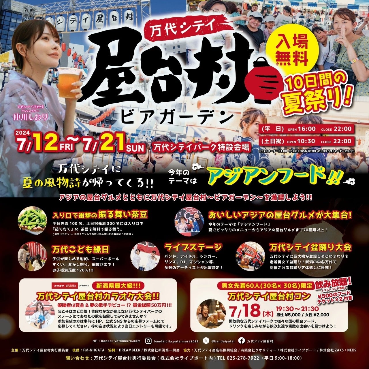 2024年7月12日(金)~7月21日(日)新潟市万代シテイパークにて『万代シテイ屋台村2024~ビアガーデン~』を開催します。万代シテイ屋台村〜ビアガーデン〜とは、2022年より万代シテイパーク(バスセンター2F)にて毎年開催される、⼤型ビアガーデンイベントです。