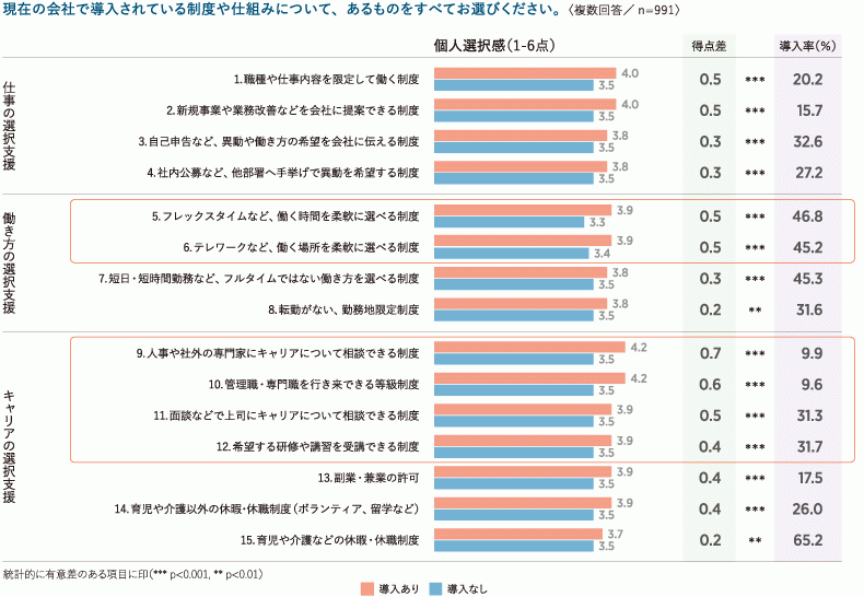 ・導入率が高く、導入の有無による個人選択感の得点差が大きかったのは、「5.フレックスタイムなど、働く時間を柔軟に選べる制度」「6.テレワークなど、働く場所を柔軟に選べる制度」であり、選択率は4割を超えた。