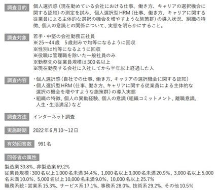 企業における経営・人事課題の解決および、事業・戦略の推進を支援する株式会社リクルートマネジメントソリューションズ(本社:東京都品川区 代表取締役社長:山﨑 淳 以下、当社)組織行動研究所は、2022年6月に、若手・中堅の会社勤務正社員991人に対し、「個人選択型HRMと個人選択感に関する意識調査」を実施し、その調査結果を公表しました。