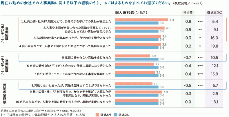 ・項目8~10は希望がかなわず異動が実現しなかった経験であるが、「8.異動したいと思ったが、異動希望を出すことができなかった」という希望を伝えることができなかった経験のみ統計的な有意差があり、個人選択感を低めていた。
