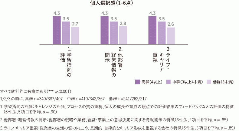 ・従業員の生活の質の向上や長期的・自律的なキャリア形成を重視するという「3.ライフ・キャリア重視」についても、高群ほど個人選択感が高かった。