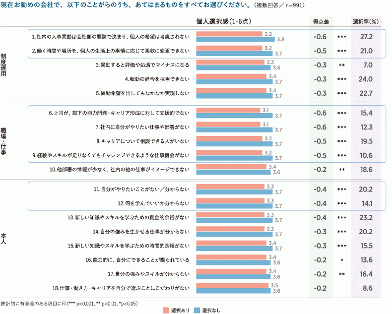 ・職場・仕事では、「6.上司が、部下の能力開発・キャリア形成に対して支援的でない」「7.社内に自分がやりたい仕事や部署がない」「8.キャリアについて相談できる人がいない」「9.経験やスキルが足りなくてもチャレンジできるような仕事機会がない」が個人選択感を低めていた。