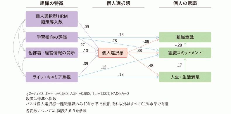 図表7 組織の特徴・個人選択感・個人の意識の関係 (共分散構造分析の結果)(n=991)