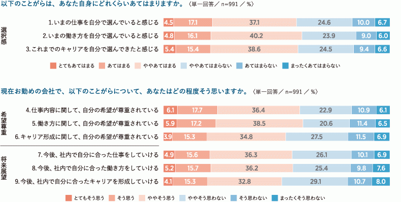 ・一方、「6.キャリア形成に関して、自分の希望が尊重されている」「9.今後、社内で自分に合ったキャリアを形成していける」が相対的に低い選択率だった(54.1%、52.3%)。